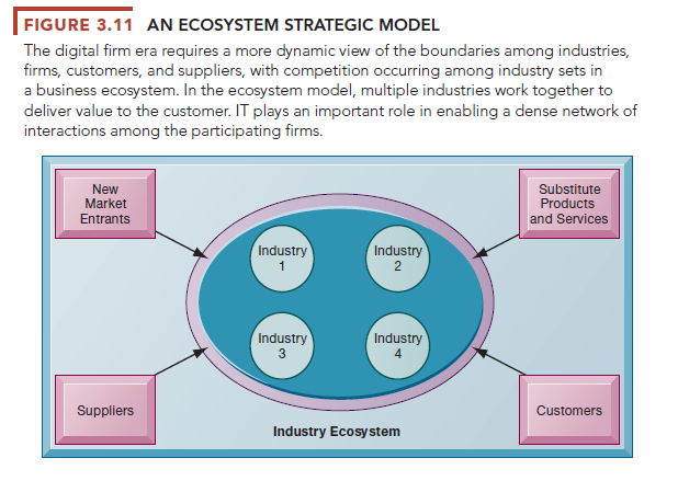 Business Ecosystems and Platforms The Internet and the emergence of digital firms call for some modification of the industry competitive forces model. The traditional Porter model assumes a relatively static industry environment; relatively clear-cut industry boundaries; and a relatively stable set of suppliers, substitutes, and customers. Instead of participating in a single industry, some of today’s firms participate in industry sets—collections of industries that provide related services and products that deliver value to the customer (see Figure 3.11). Business ecosystem is another term for these loosely coupled but interdependent networks of suppliers, distributors, outsourcing firms, transportation service firms, and technology manufacturers (Iansiti and Levien, 2004).