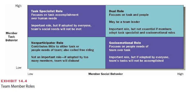 Exhibit 14.4 illustrates task specialist and socioemotional roles in teams. When most individuals in a team play a social role, the team is socially oriented. Members do not criti- cize or disagree with one another and do not forcefully offer opinions or try to accomplish team tasks because their primary interest is to keep the team happy. Teams with mostly socioemotional roles can be satisfying, but they also can be unproductive. At the other extreme, a team made up primarily of task specialists will tend to have a singular concern for task accomplishment. This team will be effective for a short period of time but will not be satisfying for members over the long run. Task specialists convey little emotional con- cern for one another, are unsupportive, and ignore team members’ social and emotional needs. The task-oriented team can be humorless and unsatisfying.