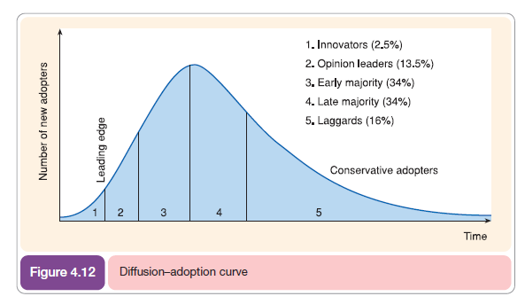 This diffusion-adoption process (represented by the bell curve in Figure 4.12) was identified by Rogers (1983) who classified those trialling new products as innovators, early adopters, early majority, late majority, or laggards.