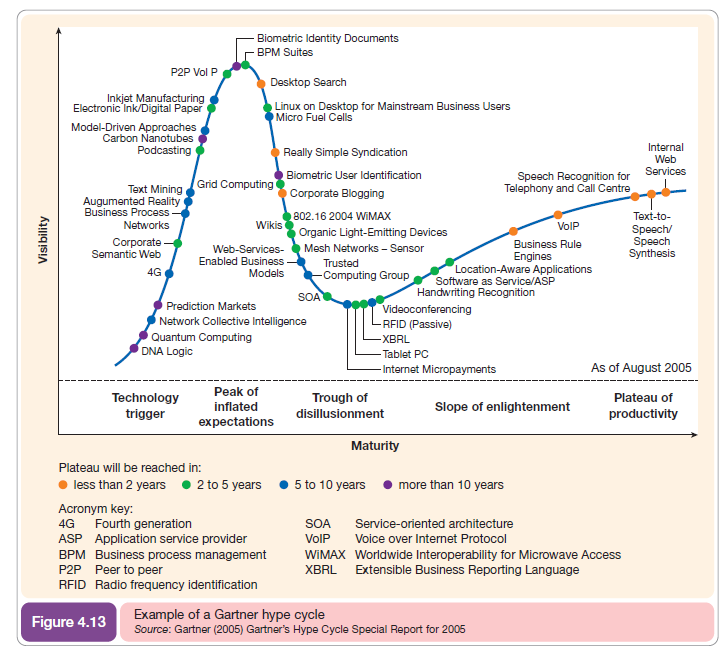 An alternative graphic representation of diffusion of innovation has been specifically developed by technology analyst Gartner for assessing the maturity, adoption and business application of specific technologies (Figure 4.13). Gartner (2005) recognizes the following stages within a hype cycle, an example of which is given in Figure 4.13 for trends current in 2005:
