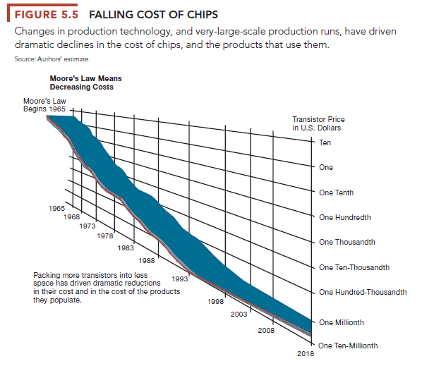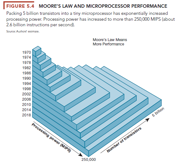 Figure 5.4 illustrates the relationship between number of transistors on a microprocessor and millions of instructions per second (MIPS), a common measure of processor power. Figure 5.5 shows the exponential decline in the cost of transistors and rise in computing power. For instance, in 2018, you could buy an Intel i7 processor chip with 2.5 billion transistors for about one ten-millionth of a dollar per transistor.