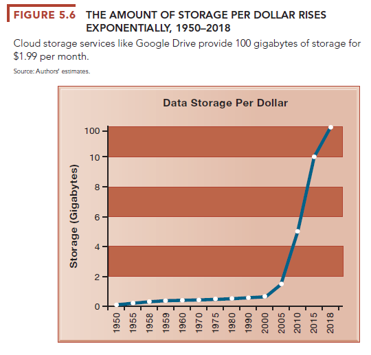 A second technology driver of IT infrastructure change is the Law of Mass Digital Storage. The amount of digital information is roughly doubling every year (Lyman and Varian, 2003). Fortunately, the cost of storing digital information is falling at an exponential rate of 100 percent a year. Figure 5.6 shows that the number of megabytes that can be stored on magnetic media for $1 from 1950 to the present roughly doubled every 15 months. In 2018, a 1 terabyte hard disk drive sells at retail for about $50.