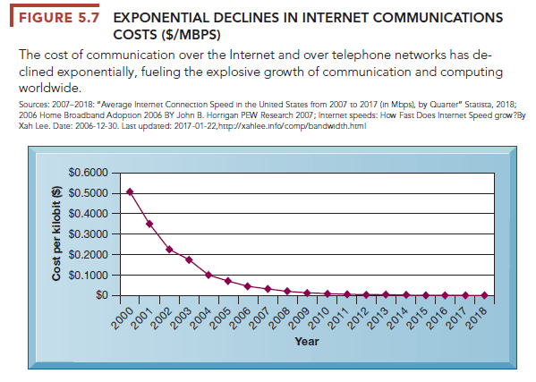 A fourth technology driver transforming IT infrastructure is the rapid decline in the costs of communication and the exponential growth in the size of the Internet. Today there are 4.2 billion Internet users worldwide (Internetworldstats.com, 2018). Figure 5.7 illustrates the exponentially declining cost of communication both over the Internet and over telephone networks (which increasingly are based on the Internet). As communication costs fall toward a very small number and approach zero, utilization of communication and computing facilities explode. In 2018, one megabit of Internet access costs about $2.60. In 2000, the cost was over $300 if available. In this same time frame, average household Internet speeds have risen from .2 Mbps to 18 Mbps.