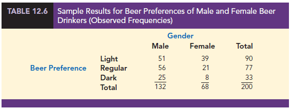 The sample data will be summarized in a two-way table with beer preferences of light, regular, and dark as one of the variables and gender of male and female as the other variable. Since an objective of the study is to determine if there is difference between the beer preferences for male and female beer drinkers, we consider gender an explanatory variable and follow the usual practice of making the explanatory variable the column variable in the data tabulation table. The beer preference is the categorical response variable and is shown as the row variable. The sample results of the 200 beer drinkers in the study are summarized in Table 12.6.