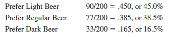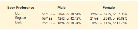 Thus male beer drinkers appear to outnumber female beer drinkers approximately 2 to 1. Sample proportions or percentages for the three types of beer are