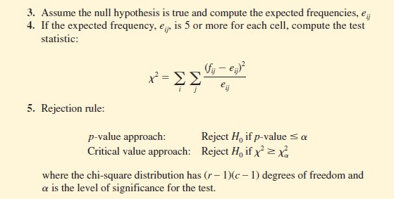With r rows and c columns in the table, the chi-square distribution will have (r – 1)(c – 1) degrees of freedom provided the expected frequency is at least 5 for each cell. Thus, in this application we will use a chi-square distribution with (3 – 1)(2 – 1) = 2 degrees of freedom. The complete steps to compute the chi-square test statistic are summarized in Table 12.8.