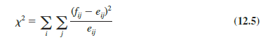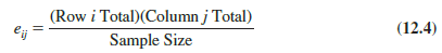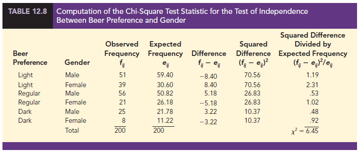 Let us now conduct the chi-square test to determine if beer preference and gender are independent. The computations and formulas used are the same as those used for the chi-square test in Section 12.1. Utilizing the observed frequencies in Table 12.6 for row i and column j, fij, we compute the expected frequencies, eij, under the assumption that the beer preferences and gender are independent. The computation of the expected frequencies follows the same logic and formula used in Section 12.1. Thus the expected frequency for row i and column j is given by