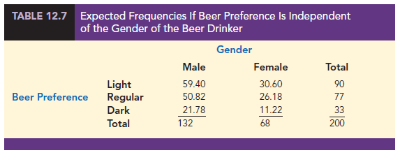 For example, e11 = (90)(132)/200 = 59.40 is the expected frequency for male beer drinkers who would prefer light beer if beer preference is independent of gender. Show that equation (12.4) can be used to find the other expected frequencies shown in Table 12.7.