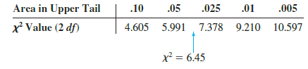 Instead of using the p-value, we could use the critical value approach to draw the same conclusion. With a = .05 and 2 degrees of freedom, the critical value for the chi-square test statistic is X205 = 5.991. The upper tail rejection region becomes