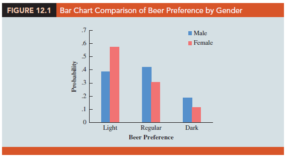 What observations can you make about the association between beer preference and gender? For female beer drinkers in the sample, the highest preference is for light beer at 57.35%. For male beer drinkers in the sample, regular beer is most frequently preferred at 42.42%. While female beer drinkers have a higher preference for light beer than males, male beer drinkers have a higher preference for both regular beer and dark beer. Data visualization through bar charts such as shown in Figure 12.1 is helpful in gaining insight as to how two categorical variables are associated.