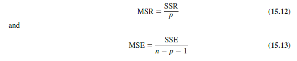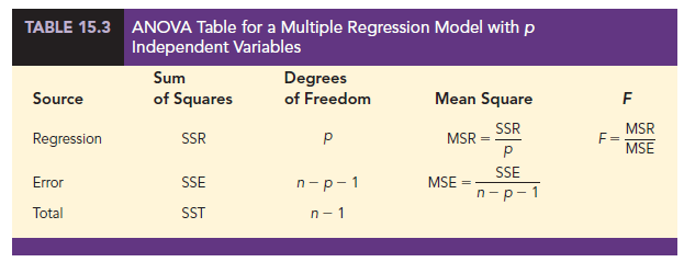 Before describing the steps of the F test, we need to review the concept of mean square. A mean square is a sum of squares divided by its corresponding degrees of freedom. In the multiple regression case, the total sum of squares has n – 1 degrees of freedom, the sum of squares due to regression (SSR) has p degrees of freedom, and the sum of squares due to error has n – p – 1 degrees of freedom. Hence, the mean square due to regression (MSR) is SSR/p and the mean square due to error (MSE) is SSE/(n – p – 1).