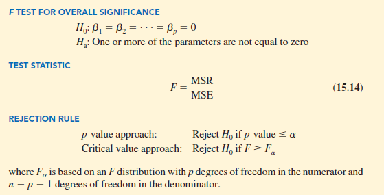 As discussed in Chapter 14, MSE provides an unbiased estimate of s2, the variance of the error term e. If H0: β1 = β2 = . . . = βp = 0 is true, MSR also provides an unbiased estimate of s2, and the value of MSR/MSE should be close to 1. However, if H0 is false, MSR overestimates s2 and the value of MSR/MSE becomes larger. To determine how large the value of MSR/MSE must be to reject H0, we make use of the fact that if H0 is true and the assumptions about the multiple regression model are valid, the sampling distribution of MSR/MSE is an F distribution with p degrees of freedom in the numerator and n – p – 1 in the denominator. A summary of the F test for significance in multiple regression follows.