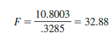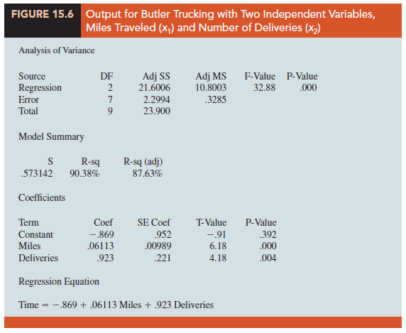 Figure 15.6 is the output for the multiple regression model with miles traveled (x1) and number of deliveries (x2) as the two independent variables. In the analysis of variance part of the output, we see that MSR = 10.8003 and MSE = .3285. Using equation (15.14), we obtain the test statistic.