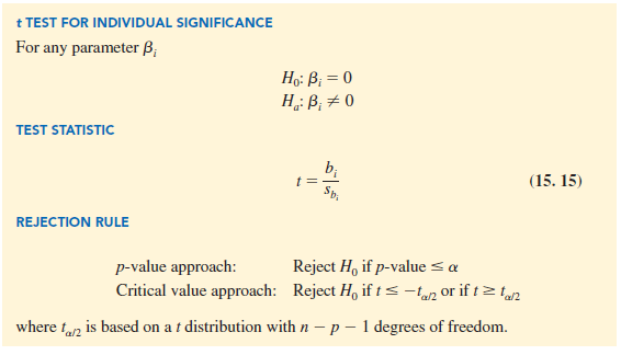 If the F test shows that the multiple regression relationship is significant, a t test can be conducted to determine the significance of each of the individual parameters. The t test for individual significance follows.