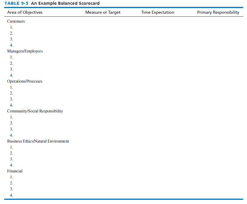 The Balanced Scorecard basic premise is that firms should establish objectives and evaluate strategies on criteria other than financial measures. Financial measures and ratios are vitally important in strategic planning, but of equal importance are factors such as customer service, employee morale, product quality, pollution abatement, business ethics, social responsibility, community involvement, and other such items. In conjunction with financial measures, these “softer” factors comprise an integral part of both the objective-setting process and the strategy-evaluation process. A Balanced Scorecard for a firm is simply a listing of all key objectives to work toward, along with an associated time dimension of when each objective is to be accomplished, as well as a primary responsibility or contact person, department, or division for each objective.
