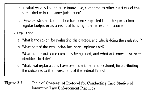 The protocol is a major way of increasing the reliability of case study research and is intended to guide the investigator in carrying out the data collection from a single case (again, even if the single case is one of several in a multiple-case study). Figure 3.2 gives a table of contents from an illustrative protocol, which was used in a study of innovative law enforcement practices supported by federal funds. The practices had been defined earlier through a careful screening process (see later discussion in this chapter for more detail on “screening case study nominations”). Furthermore, because data were to be collected from 18 such cases as part of a multiple-case study, the information about any given case could not be collected in great depth, and thus the number of the case study questions was minimal.