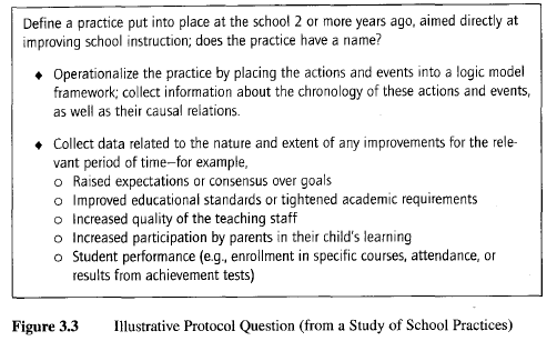 - case study questions (the specific questions that the case study investigator must keep in mind in collecting data, “table shells” for specific arrays of data, and the potential sources of information for answering each question—see Figure 3.3 for an example), and