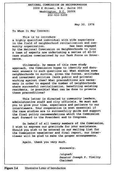A procedural element of this background section is a statement about the project which you can present to anyone who may want to know about the project, its purpose, and the people involved in conducting and sponsoring the project. This statement can even be accompanied by a letter of introduction, to be sent to all major interviewees and organizations that may be the subject of study. (See Figure 3.4 for an illustrative letter.) The bulk of the overview, however, should be devoted to the substantive issues being investigated. This may include the rationale for selecting the case(s), the propositions or hypotheses being examined, and the broader theoretical or policy relevance of the inquiry. For all of these topics, relevant readings should be cited, and the essential reading materials should be made available to everyone on the case study team.