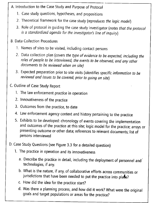 The protocol is a major way of increasing the reliability of case study research and is intended to guide the investigator in carrying out the data collection from a single case (again, even if the single case is one of several in a multiple-case study). Figure 3.2 gives a table of contents from an illustrative protocol, which was used in a study of innovative law enforcement practices supported by federal funds. The practices had been defined earlier through a careful screening process (see later discussion in this chapter for more detail on “screening case study nominations”). Furthermore, because data were to be collected from 18 such cases as part of a multiple-case study, the information about any given case could not be collected in great depth, and thus the number of the case study questions was minimal.