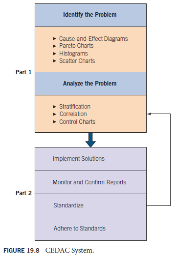 The CEDAC system can be divided into two main parts (see Figure 19.8). Each part is subdivided into several related activities. In part 1, a problem is identified. Quality tools such as those explained in Chapter 15 are used, as are additional quality tools, to analyze the problem. Based on the analysis, solutions are implemented in part 2. Results are monitored and confirmed. If the results are positive, the procedures that solved the problem are standardized, and these new standard procedures are followed by all employees. If the desired results are not achieved, the team returns to part 1 to analyze the problem again.