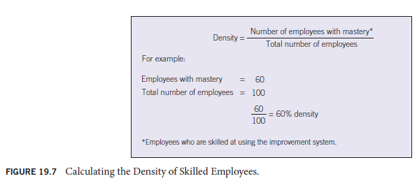 - A favorable environment. Continual improvement will not occur unless an environment favorable to it exists. The keys to creating and maintaining an environment favorable to continual improvement are leadership and education. Leadership manifests itself in the form of commitment, both to the concept of continual improvement and to the allocation of the necessary resources. Education is how employees become skilled in the use of the improvement system. The higher the density of employees who are skilled in the use of the improvement system, the better. Density is expressed as a percentage (see Figure 19.7).