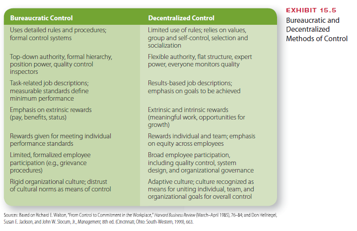 Exhibit 15.5 contrasts the use of bureaucratic and decentralized methods of control. Bureaucratic methods define explicit rules, policies, and procedures for employee behavior. Control relies on centralized authority, the formal hierarchy, and close personal supervision. Responsibility for quality control rests with quality control inspectors and supervisors rather than with employees. Job descriptions generally are specific and task related, and managers de-fine minimal standards for acceptable employee performance. In exchange for meeting the standards, individual employees are given extrinsic rewards such as wages, benefits, and possi- bly promotions up the hierarchy. Employees rarely participate in the control process, with any participation being formalized through mechanisms such as grievance procedures. With bu- reaucratic control, the organizational culture is somewhat rigid, and managers do not consider culture a useful means of controlling employees and the organization. Technology often is used to control the flow and pace of work or to monitor employees, such as by measuring how long employees spend on phone calls or how many keystrokes they make at the computer.