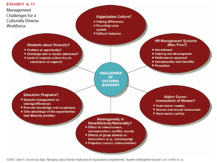 What do these factors mean for managers who are responsible for creating a workplace that offers fulfilling work, opportunities for professional development and career advancement, and respect for all individuals? Inappropriate behavior by employees lands squarely at the door of the organization’s top executives. Managers can look at different areas of the orga- nization to see how well they are doing in creating a workplace that values and supports all people. Exhibit 9.11 illustrates some of the key areas of management challenge for dealing with a diverse workforce. Managers focus on these issues to see how well they are address- ing the needs and concerns of diverse employees. One step is to ensure that their organiza- tions’ HR systems are designed to be bias-free, dropping the perception of the middle-aged white male as the ideal employee. Consider how the FBI expanded its recruiting efforts.