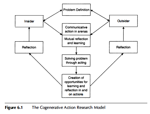 This model identifies two main groups of actors. The insiders are the focal point of every AR project. They are the “owners” of the problem, but they are not homogeneous, egalitarian, or in any way an ideal group. They simply “own” the problem. Outsiders are the professional researchers who seek to facilitate a colearning process aimed at solving local problems and to make contributions to the scientific discourse. Insiders and outsiders are both equal and different. They are different because most insiders have to live directly with the results of any change activity in a project, whereas most outsiders can leave. Another difference is that the insiders have the central influence on what the focus of the research activity should be.