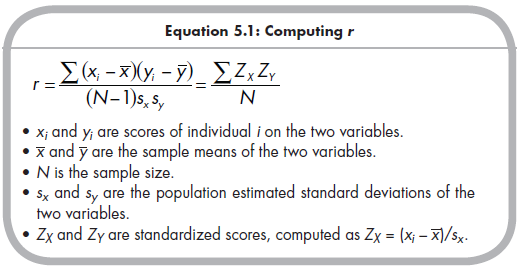 The conceptual meaning of positive correlations is that individuals who score high on X (relative to the sample mean on X) also tend to score high on Y (relative to the sample mean on Y), whereas individuals who score low on X also tend to score low on Y. The conceptual meaning of negative correlations is that individuals who score high on one variable tend to score low on the other variable. The rightmost portion of Equation 5.1 provides an alternative representation that illustrates this conceptual meaning. Here, Z scores (standardized scores) represent high values as positive and low values as negative, so a preponderance of high scores with high scores (product of two positive) and low scores with low scores (product of two negative) yields a positive average cross product, whereas high scores with low scores (product of positive and negative) yield a negative average cross product.