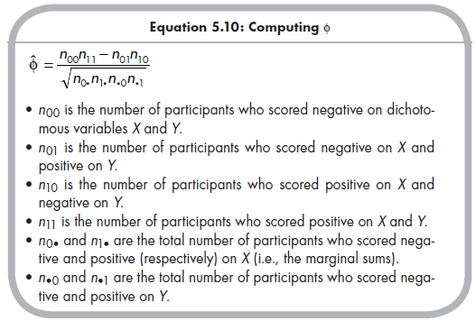 Despite the lack of similarity in appearance between this equation and Equation 5.1, Φ is identical to computing r between the two dichotomous variables, X and Y. In fact, if you are meta-analyzing a set of studies involving associations between two continuous variables in which a small number of studies artificially dichotomize the variables, it is appropriate to compute ^ and interpret this as a correlation (you might also consider correcting for the attenuation of correlation due to artificial dichotomization; see Chapter 6).