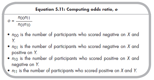 To understand the odds ratio, you must first consider the definition of odds. The odds of an event is defined as the probability of the event (e.g., of scoring affirmative on a dichotomous measure) divided by the probability of the alternative (e.g., of scoring negative on the measure), which can be expressed as odds = p / (1 – p), where p equals the proportion in the sample (which is an unbiased estimate of population proportion, n) having the characteristic or experiencing the event. For example, if you conceptualized children’s aggression as a dichotomous variable of occurring versus not occurring, you could find the proportion of children who are aggressive (p) and estimate the odds of being aggressive by dividing by the proportion of children who are not aggressive (1 – p). Note that you can also compute odds for nominal dichotomies; for example, you could consider biological sex in terms of the odds of being male versus female, or vice versa.