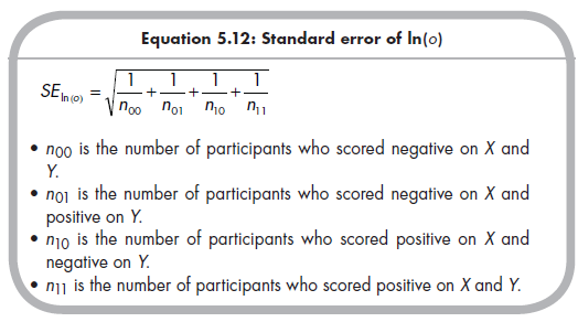 The odds ratio is 1.0 when there is no association between the two dichotomous variables, ranges from 0 to 1 when the association is negative, and ranges from 1 to positive infinity when the association is positive. Given these ranges, the distribution of sample estimates around a population odds ratio is necessarily skewed. Therefore, it is common to use the natural log transformation of the odds ratio when performing meta-analytic combina-tion or comparison, expressed as ln(o). The standard error of this logged odds ratio is easily computed (whereas computing the standard error of an untransformed odds ratio is more complex; see Fleiss, 1994), using the following equation: