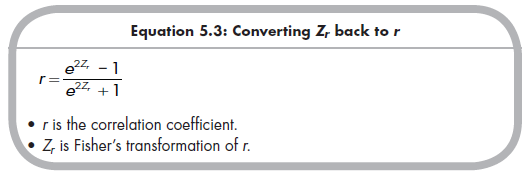The reason that r is often transformed to Zr in meta-analyses is because the distribution of sample r’s around a given population p is skewed (except in sample sizes larger than those commonly seen in the social sciences), whereas a sample of Zrs around a population Zr is symmetric (for further details see Hedges & Olkin, 1985, pp. 226-228; Schulze, 2004, pp. 21-28).2 This symmetry is desirable when combining and comparing effect sizes across studies. However, Zr is less readily interpretable than r both because it is not bounded (i.e., it can have values greater than ±1.0) and simply because it is unfamiliar to many readers. Typical practice is to compute r for each study, convert these to Zr for meta-analytic combination and comparison, and then convert results of the meta-analysis (e.g., mean effect size) back to r for reporting. Equation 5.3 converts Zr back to r.