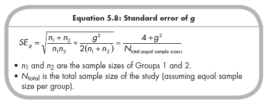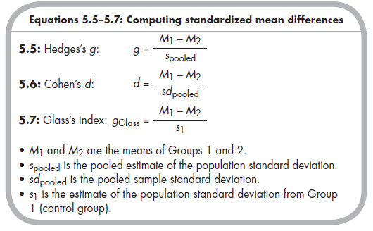 These three equations are identical in consisting of a raw (unstandardized) difference of means as their numerators. The difference among them is in the standard deviations comprising the denominators (i.e., the standardization of the mean difference). The equation (5.5) for Hedges’s g uses the pooled estimates5 of the population standard deviations of each group, which is the familiar