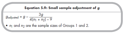 Before ending this discussion of standardized mean difference effect sizes, it is worth considering a correction that you should use when primary study sample sizes are small (e.g., less than 20). Hedges and Olkin (1985) have shown that g is a biased estimate of the population standardized mean differences, with the magnitude of overestimation becoming nontrivial with small sample sizes. Therefore, if your meta-analysis includes studies with small samples, you should apply the following correction of g for small sample size (Hedges & Olkin, 1985, p. 79; Lipsey & Wilson, 2001, p. 49):