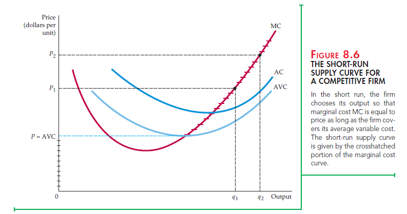 Figure 8.6 illustrates the short-run supply curve. Note that for any P greater than minimum AVC, the profit-maximizing output can be read directly from the graph. At a price P1, for example, the quantity supplied will be q1; and at P2, it will be q2. For P less than (or equal to) minimum AVC, the profit-maximizing output is equal to zero. In Figure 8.6 the entire short-run supply curve consists of the crosshatched portion of the vertical axis plus the marginal cost curve above the point of minimum average variable cost.
