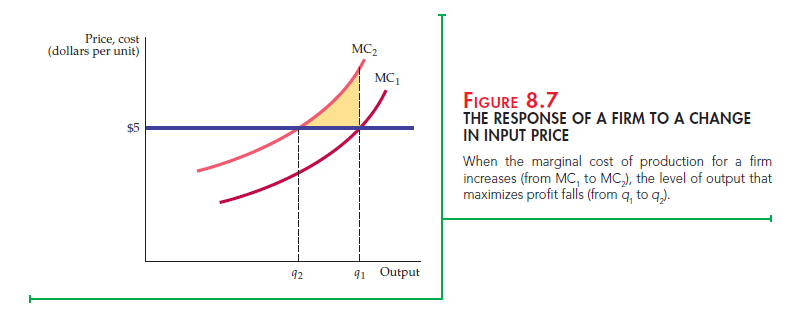 Figure 8.7 shows a firm’s marginal cost curve that is initially given by MC1 when the firm faces a price of $5 for its product. The firm maximizes profit by producing an output of q1. Now suppose the price of one input increases. Because it now costs more to produce each unit of output, this increase causes the marginal cost curve to shift upward from MC1 to MC2. The new profit-maximizing output is q2, at which P = MC2. Thus, the higher input price causes the firm to reduce its output.
