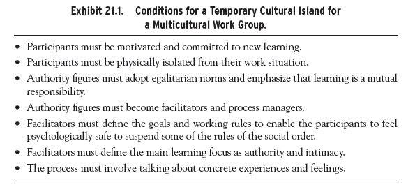 It is my proposition that for multicultural collaborations to work, the members must first learn about each other in a temporary cultural island. The leaders and managers who create such groups must therefore develop the skills to create temporary cultural island experiences for the members to enable them to work effectively. How would a leader design such a situation? Exhibit 21.1 shows the essential conditions that are needed for this learning process to be successful.