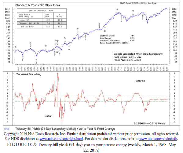 Ned Davis Research developed a simple trading rule for long-term interest rates. It is the number of points a three-week moving average changes, up or down. If the long-rate measure declines by 8.7% from a weekly peak, a buy signal is generated. On the other hand, a sell signal is generated when the long-term rate average advances 11.7% from a weekly low. The performance history of this simple method produced an average annual return of 9.8% in the S&P 500 over the past 50 years. This is compared with a buy-and-hold gain of only 6.6%.