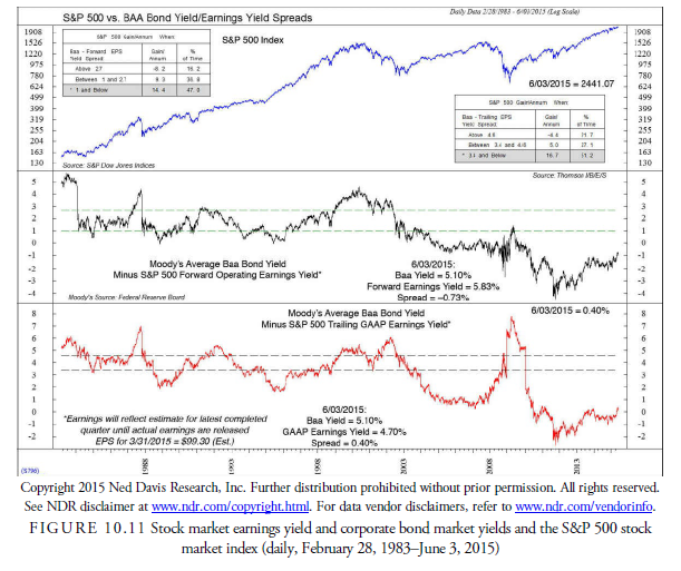 If we consider the inverse of the P/E ratio for stocks as the stock yield—that is, the earnings return percentage of the stock’s market price, and the yield on average corporate bonds, the Moody’s Baa Bond index —in a ratio format, we should see how they are performing against each other and learn about which market, the stock or bond market, has the highest current return. In Figure 10.11, we show the Ned Davis Research, Inc. plot of this ratio and the signals it has generated for the stock market (and conversely for the bond market as the alternative investment). When the bond market is performing better than the stock market by 4.6 percentage points, the annualized gain in the stock market has been minus 4.4%. When the bond market has fallen behind the stock market by 3.4 percentage points, the annualized gain in the stock market has risen to plus 16.7%.