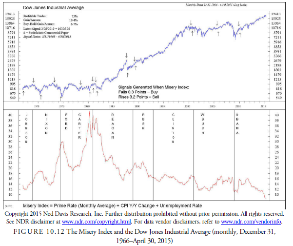 Figure 10.12 shows how the level of the misery index has related to the performance of the DJIA since 1966. This figure shows the results of buying the DJIA whenever misery index falls by 0.3 points and selling the DJIA whenever the index rises by 3.2 points. The trading accuracy of this system is 75% favorable, and its gain per annum is greater than the buy-and-hold gain per annum by 3.7%. Because the calculation of the misery index is easy and low cost, the profitable results of this trading system appear valuable.