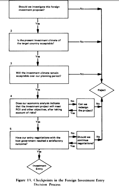 The investment entry decision process involves several subdecisions taken over a lengthy period of time, with multiple feedbacks that stimulate the reconsideration of earlier decisions. Figure 13 seeks to structure this complex decision process by means of a sequence of checkpoints that must be passed if an investment proposal is to gain acceptance.