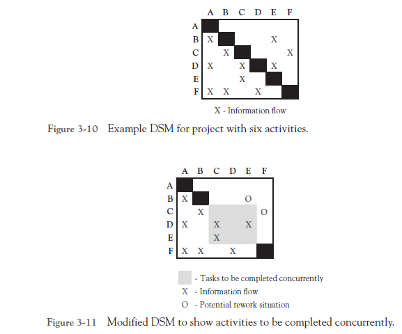 As the example illustrates, a key benefit of constructing a DSM is the ability to quickly identify and better understand how information is needed. It can also highlight potential information flow problems even before the project is started. For example, all the X’s above the diagonal in Figure 3-10 are related to situations where information obtained from a subsequent task might require the rework of an earlier completed task. To illustrate, in the second row we observe that activity b requires information from activity e. Since activity e is completed after activity b, activity b may need to be revisited and reworked depending on what is learned after completing activity e.