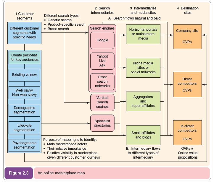 Analysis of the online marketplace or ‘marketspace’ is a key part of developing a long-term e-business plan or creating a shorter-term digital marketing campaign. Completing a marketplace analysis helps to define the main types of online presence that are part of a ‘click ecosystem’ which describes the consumer behaviour (Chapter 9) or flow of online visitors between search engines, media sites and other intermediaries to an organization and its competitors. Prospects and customers in an online marketplace will naturally turn to search engines to find products, services, brands and entertainment. Search engines act as a distribution system which connects searchers to different intermediary sites for different phrases, so the flow of visits between sites must be understood by the marketer in their sector.