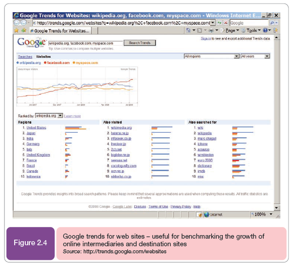 - Search intermediaries. These are the main search engines in each country. Typically they are Google, Yahoo!, Microsoft Live Search and Ask, but others are important in some markets such as China (Baidu), Russia (Yandex) and South Korea (Naver). You can use audience panel data from different providers indicated in Box 2.1 to find out their relative importance in different countries. The Google Trends tool (Figure 2.4) is a free tool for assessing site popularity and the searches used to find sites and how they vary seasonally, which is useful for student assignments.