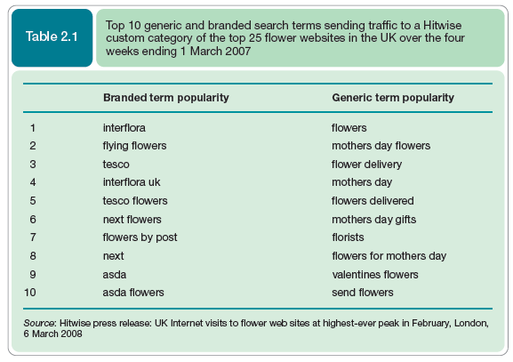 Companies need to know which sites are effective in harnessing search traffic and either partner with them or try to obtain a share of the search traffic using the search engine marketing and affiliate marketing techniques explained in Chapter 9. Well-known, trusted brands which have developed customer loyalty are in a good position to succeed online since a common consumer behaviour is to go straight to the site through entering a URL or from a bookmark or e-mail. Alternatively they may search for the brand or URL. Hitwise provides this type of insight, as shown in Table 2.1. Through evaluating the type and volume of phrases used to search for products in a given market it is possible to calculate the total potential opportunity and the current share of search terms for a company. ‘Share of search’ can be determined from web analytics reports from the company site which indicate the precise key phrases used by visitors to actually reach a site from different search engines.