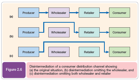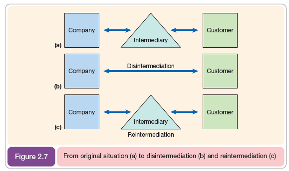 The relationship between a company and its channel partners shown in Figure 2.5 can be dramatically altered by the opportunities afforded by the Internet. This occurs because the Internet offers a means of bypassing some of the channel partners. This process is known as disintermediation or ‘cutting out the middleman’.