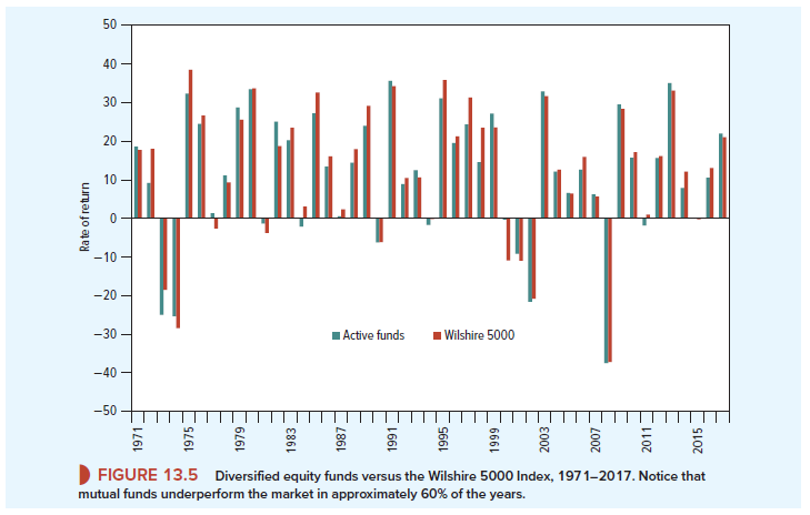 Tests of the strong form of the efficient markets hypothesis have examined whether professional portfolio managers can consistently “beat the market.” Some researchers have found a slight persistent outperformance, but just as many have concluded that professionally managed funds fail to recoup the costs of management. Look, for example, at Figure 13.4, which compares the returns on diversified equity funds to the Wilshire 5000 Index. You can see that in some years, the mutual funds beat the market, but roughly 60% of the time, it was the other way around.