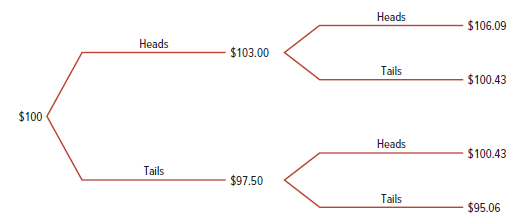 If you are not sure what we mean by “random walk,” you might like to think of the following example: You are given $100 to play a game. At the end of each week a coin is tossed. If it comes up heads, you win 3% of your investment; if it is tails, you lose 2.5%. Therefore, your capital at the end of the first week is either $103.00 or $97.50. At the end of the second week, the coin is tossed again. Now the possible outcomes are: