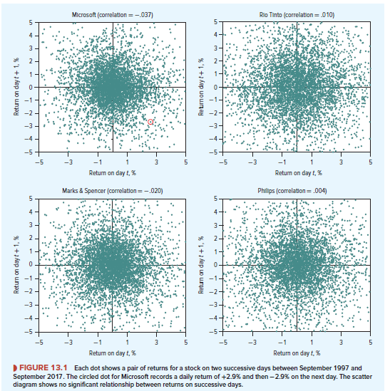 When Maurice Kendall suggested that stock prices follow a random walk, he was implying that the price changes are independent of one another just as the gains and losses in our cointossing game were independent. Figure 13.1 illustrates this for four stocks from different markets —Microsoft, Marks & Spencer, Philips, and Rio Tinto. Each panel shows the change in price of the stock on successive days. The circled dot in the southeast quadrant of the Microsoft panel refers to a pair of days in which a 2.9% increase was followed by a 2.9% decrease. If there were a systematic tendency for increases to be followed by decreases, there would be many dots in the southeast quadrant and few in the northeast quadrant. It is obvious from a glance that there is very little pattern in these price movements, but we can test this more precisely by calculating the coefficient of correlation between each day’s price change and the next. If price movements persisted, the correlation would be positive; if there were no relationship, it would be 0. In our example, the correlation between successive price changes in Microsoft stock was -.037; there was a negligible tendency for price rises to be followed by price falls.[3] For Marks & Spencer, this correlation was also negative at -.020. For Rio Tinto, it was positive at +.010, and for Philips, the correlation was also just positive at +.004.